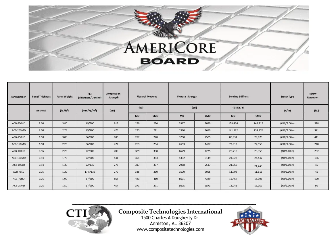AmeriCore™ Boards are composite sandwich core panels that are reinforced with fiberglass on each side and meet the most stringent physical requirements of the marine, transportation, and construction industries. AmeriCore Boards are ideal for coring materials for highly loaded sandwich structures and for use on their own as a replacement for plywood. AmeriCore Boards are available from ½” to 4” thick, making them the perfect choice for transoms, bulkheads, stringers, decking, walls, and roofs. Furthermore, the mechanical properties of AmeriCore Boards far exceed those of urethane boards of the same density and thickness. AmeriCore Boards are comprised of 100% composite materials and are durable and long lasting. AmeriCore Boards are also weatherproof; they will not absorb water, rot, or deteriorate -- even with prolonged exposure to the earth's harshest environments. AmeriCore Boards are strong yet lightweight and offer the potential for reduced weight and increased fuel efficiency. AmeriCore Boards also have low thermal conductivity and offer excellent sound abatement, making for the most comfortable ride for passengers and cargo.